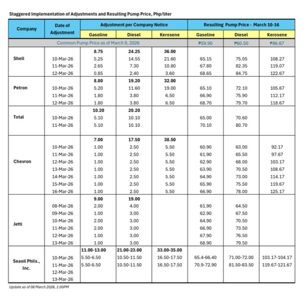 The Department of Energy (DOE) announced that several oil companies will implement staggered pump price adjustments for petroleum products starting March 10, 2026. The measure comes amid continued volatility in international oil prices driven by developments in the Middle East.